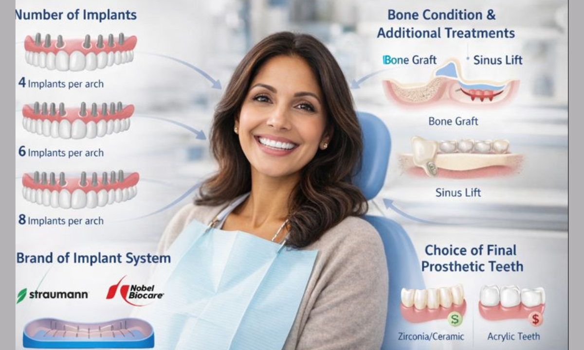 In some cases, a patient may require 4 implants per arch (All-on-4), while in other cases, 6 or even 8 implants may be necessary for added support. More implants imply higher surgical and material costs.
